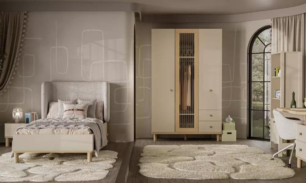 Takım içeriğinde 1 adet Maya 3 Kapaklı Dolap, 1 adet Maya Çalışma Masası Alt Modül, 1 adet Maya 100*200 Başlıklı Karyola bulunmaktadır.